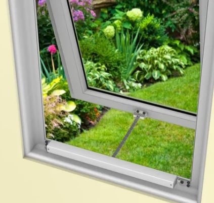 Sistema muy compacto que se instala al centro de la ventana abatible por dentro de la ventana, al activarlo este se va sacado una cadena rígida la cual va empujando el marco abatible de la ventana.